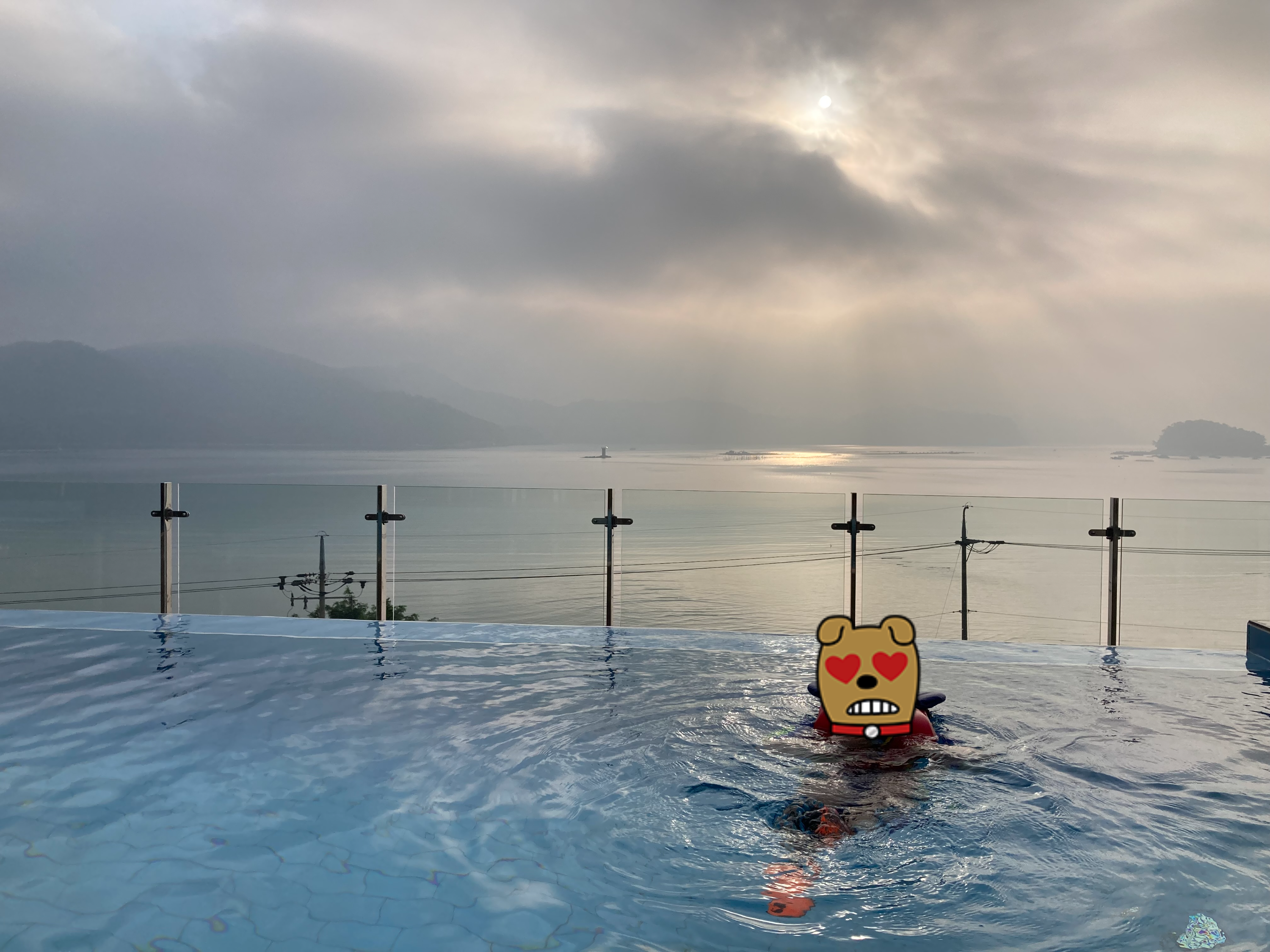 아이들이 수영을 좋아해서 펜션을 알아볼 때는 대부분 수영장이 있는 펜션 위주로 찾게 됩니다. 그리즐리 펜션은 실내수영장과 야외 인피니티풀 수영장 2개가 있어서 아이들이 왔다 갔다 놀기에 좋았습니다. 특히 인티피니풀에서 아침 수영을 하니 참 좋더라고요. 수영장에 아이들 튜브가 비치되어 있습니다.