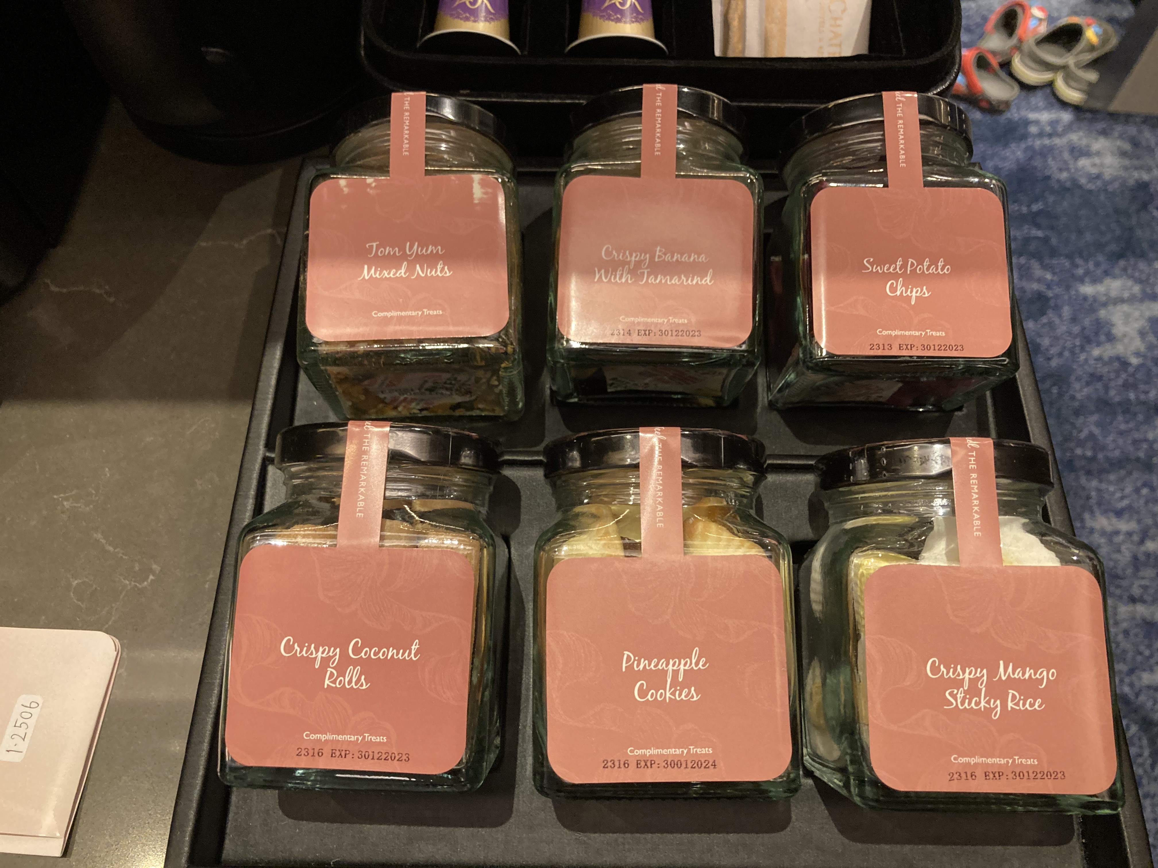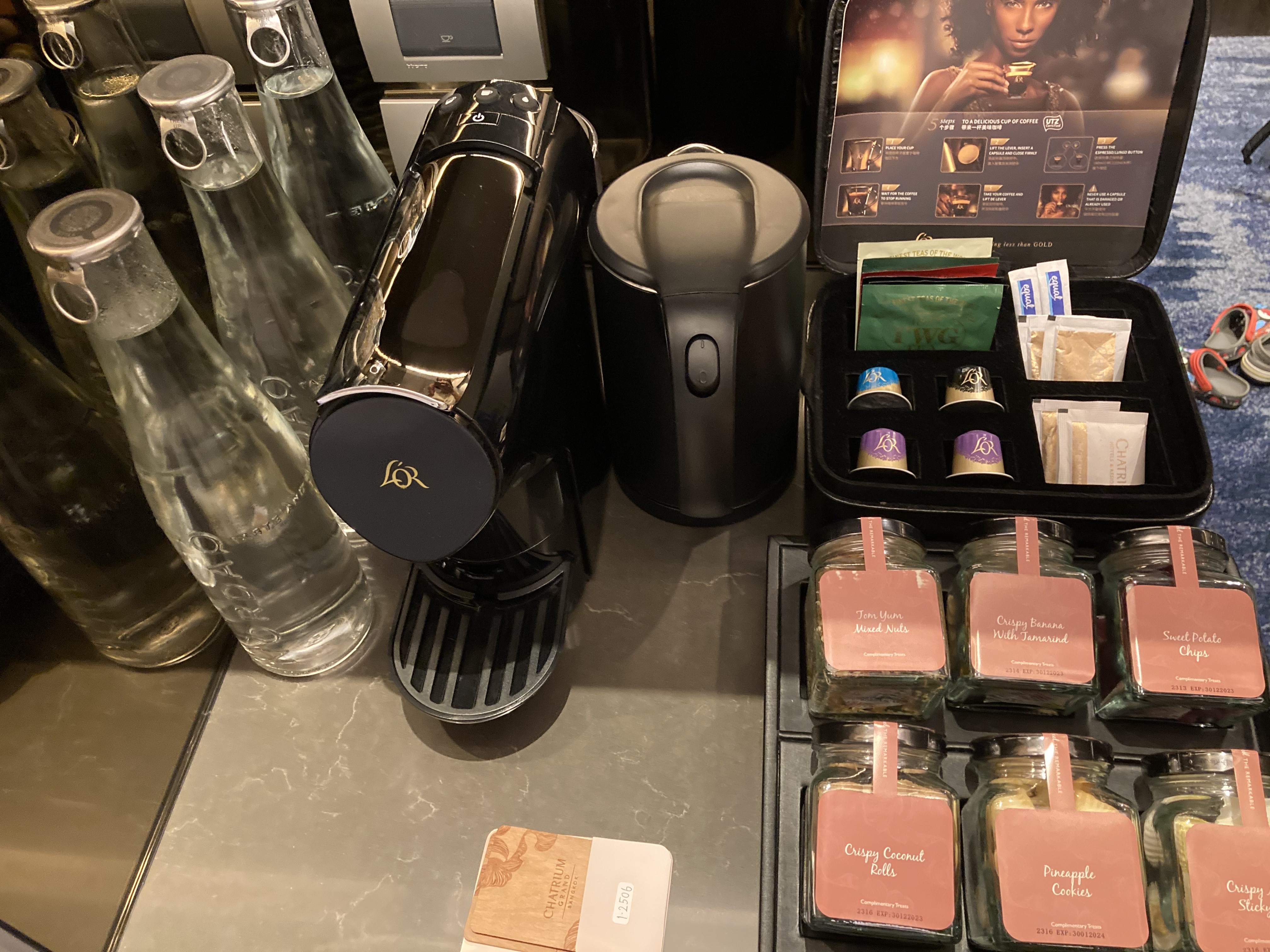 웰컴 초콜렛과 웰컴 군것질들이 이렇게 있네요.새벽에 도착해서 살짝 배가 고팠는데 간단하게 먹으니 좋더라고요.오랜만에 보니 TWG티를 보니 반갑네요.냉장고에는 탄산음료도 들어있고 생수도 계속 비치해 주시더라고요~